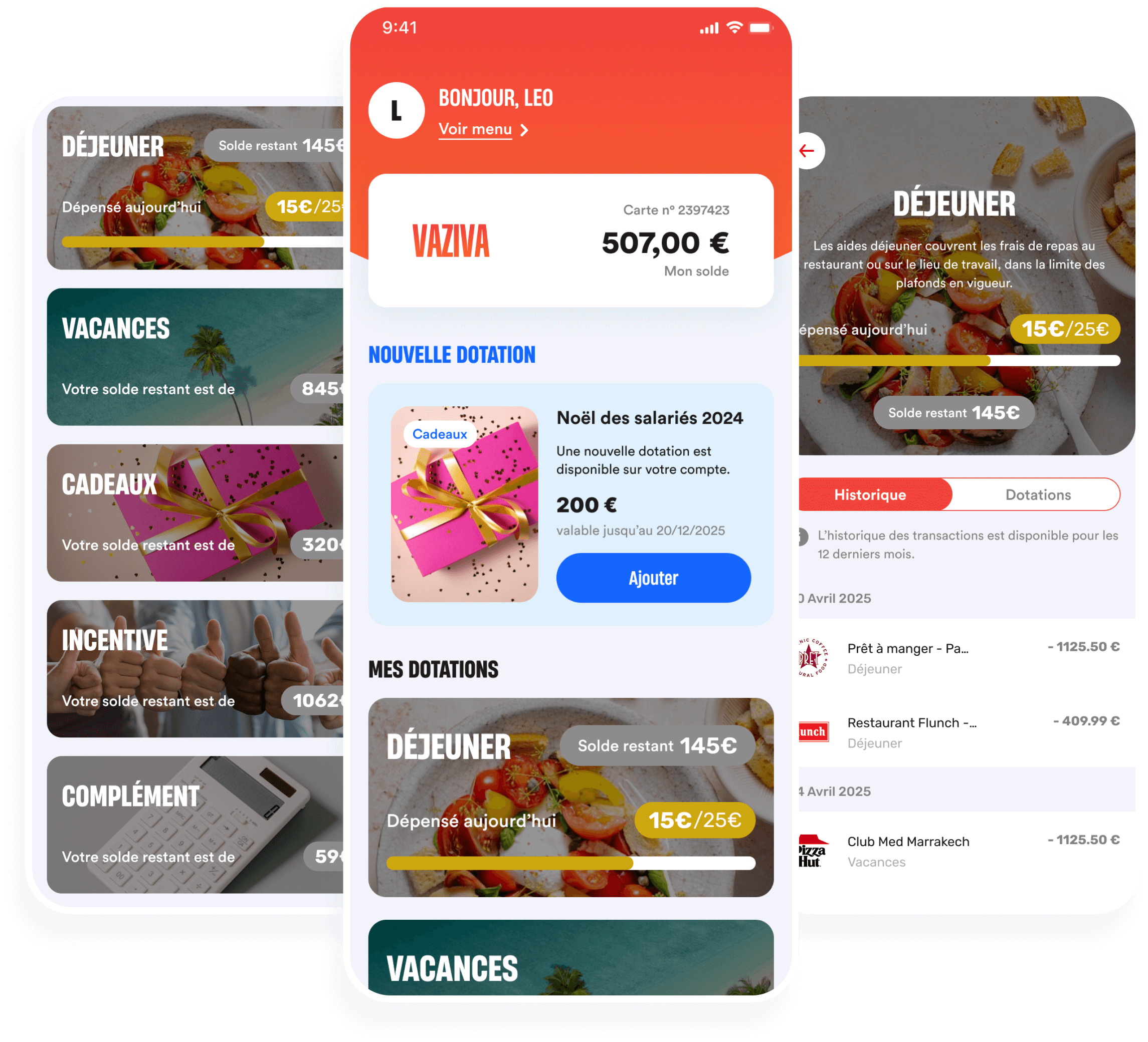 L’application présente un dashboard clair affichant le solde global ainsi que le détail des dotations par catégorie (vacances, cadeaux, déjeuner). Chaque catégorie dispose de son propre historique de transactions et d’un affichage du solde restant.